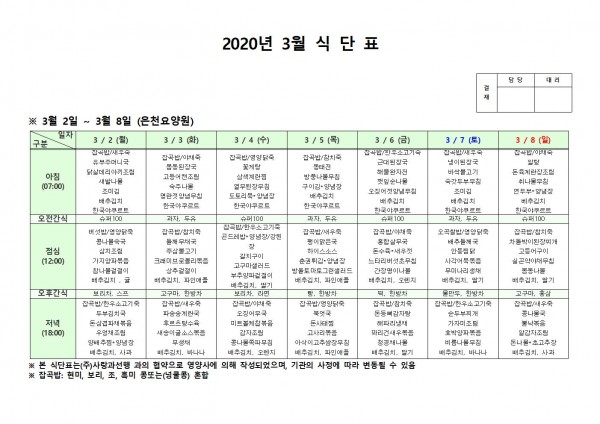 3월 첫째주 식단표 페이지 정보 작성자 은천노인복지회 작성일20-03-09 11:55 조회180,426회 댓글0건 관련링크 이전글 다음글 목록 답변 본문 . 이전글 다음글 목록 답변