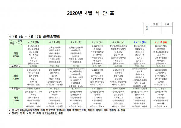 4월 첫째주 식단표 페이지 정보 작성자 은천노인복지회 작성일20-04-13 15:04 조회178,954회 댓글0건 관련링크 이전글 다음글 목록 답변 본문 . 이전글 다음글 목록 답변