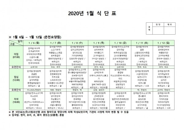 1월 첫째주 식단표 페이지 정보 작성자 은천노인복지회 작성일20-01-13 10:55 조회187,471회 댓글0건 관련링크 이전글 다음글 목록 답변 본문 1월 첫째주 식단표입니다. 이전글 다음글 목록 답변