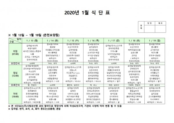 1월 둘째주 식단표 페이지 정보 작성자 은천노인복지회 작성일20-01-21 11:11 조회186,923회 댓글0건 관련링크 이전글 다음글 목록 답변 본문 1월 둘째주 식단표입니다 이전글 다음글 목록 답변