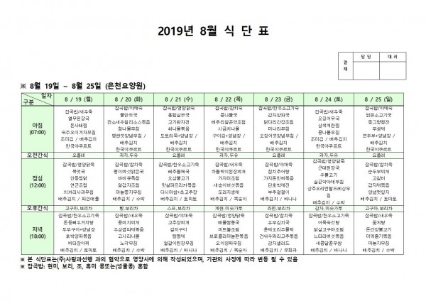 8월 넷째주 식단표 페이지 정보 작성자 은천노인복지회 작성일19-08-26 16:38 조회196,204회 댓글0건 관련링크 이전글 다음글 목록 답변 본문 8월 넷째주 식단표 이전글 다음글 목록 답변