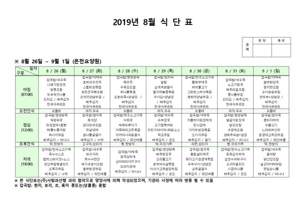 8월 다섯째주 식단표 페이지 정보 작성자 은천노인복지회 작성일19-09-04 17:29 조회197,631회 댓글0건 관련링크 이전글 다음글 목록 답변 본문 8월 다섯째주 식단표 이전글 다음글 목록 답변