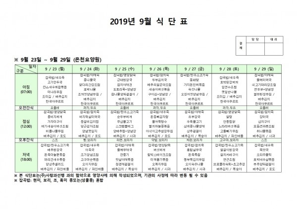 9월 넷째주 식단표 페이지 정보 작성자 은천노인복지회 작성일19-09-30 14:47 조회195,302회 댓글0건 관련링크 이전글 다음글 목록 답변 본문 9월 넷째주 식단표 이전글 다음글 목록 답변