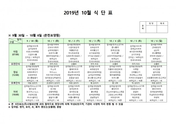 10월 첫째주 식단표 페이지 정보 작성자 은천노인복지회 작성일19-10-07 15:21 조회194,831회 댓글0건 관련링크 이전글 다음글 목록 답변 본문 10월 첫째주 식단표 이전글 다음글 목록 답변