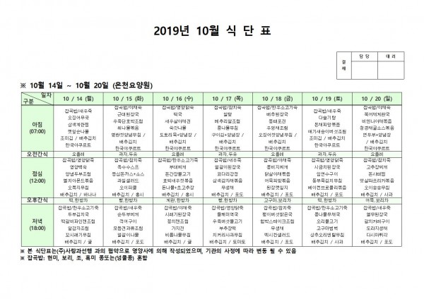 10월 셋째주 식단표 페이지 정보 작성자 은천노인복지회 작성일19-10-21 15:50 조회193,716회 댓글0건 관련링크 이전글 다음글 목록 답변 본문 10월 셋째주 식단표 이전글 다음글 목록 답변
