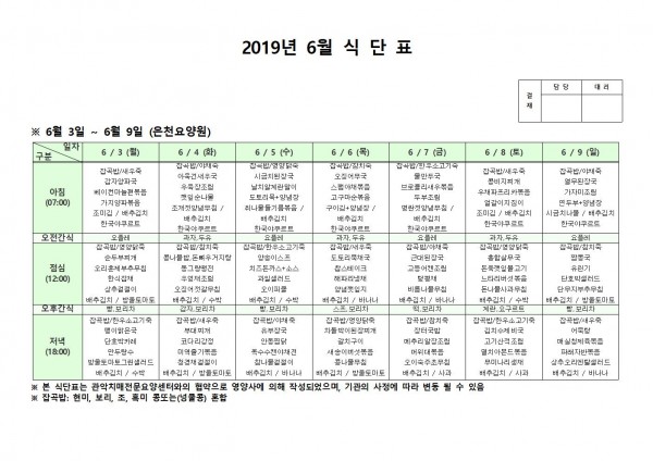 6월 첫째주 식단표 페이지 정보 작성자 은천노인복지회 작성일19-06-10 11:57 조회202,424회 댓글0건 관련링크 이전글 다음글 목록 답변 본문 6월 첫째주 식단표 이전글 다음글 목록 답변