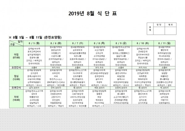 8월 둘째주 식단표 페이지 정보 작성자 은천노인복지회 작성일19-08-19 15:26 조회197,930회 댓글0건 관련링크 이전글 다음글 목록 답변 본문 8월 둘째주 식단표 이전글 다음글 목록 답변