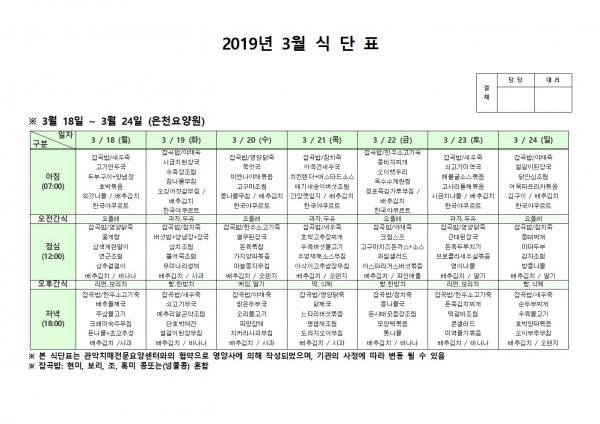 3월 셋째주 식단표 페이지 정보 작성자 은천노인복지회 작성일19-03-25 11:11 조회205,965회 댓글0건 관련링크 이전글 다음글 목록 답변 본문 3월 셋째주 식단표 이전글 다음글 목록 답변