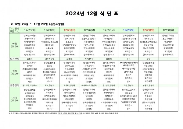 12월 넷째주 식단표 페이지 정보 작성자 은천노인복지회 작성일24-12-23 16:39 조회19,517회 댓글0건 관련링크 이전글 다음글 목록 답변 본문 . 이전글 다음글 목록 답변
