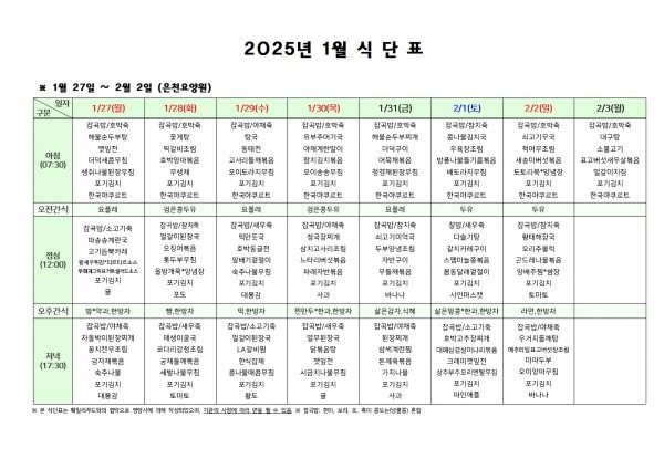 1월 다섯째주 식단표 페이지 정보 작성자 은천노인복지회 작성일25-01-24 10:07 조회16,959회 댓글0건 관련링크 이전글 다음글 목록 답변 본문 . 이전글 다음글 목록 답변