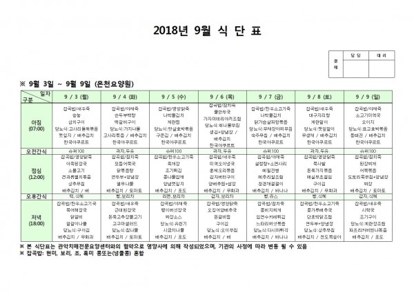 9월 첫째주 식단표 페이지 정보 작성자 은천노인복지회 작성일18-09-11 09:27 조회207,533회 댓글0건 관련링크 이전글 다음글 목록 답변 본문 9월 첫째주 식단표 이전글 다음글 목록 답변