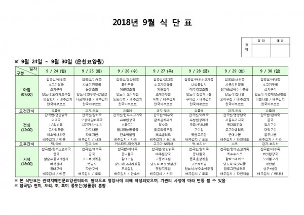 9월 넷째주 식단표 페이지 정보 작성자 은천노인복지회 작성일18-10-08 11:06 조회206,717회 댓글0건 관련링크 이전글 다음글 목록 답변 본문 9월 넷째주 식단표 이전글 다음글 목록 답변