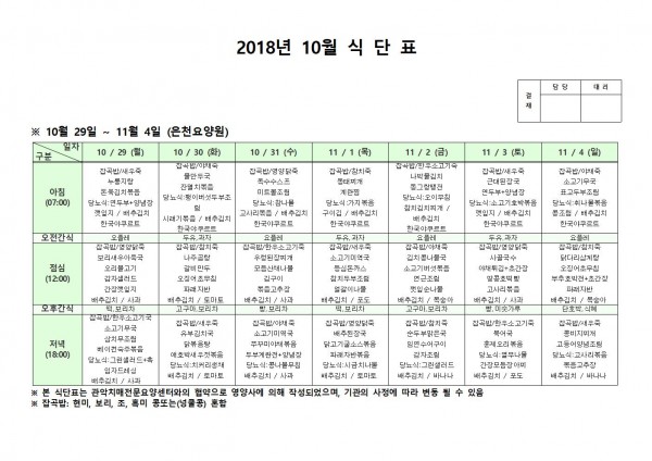 10월 5주째 식단표 페이지 정보 작성자 은천노인복지회 작성일18-12-07 09:36 조회208,097회 댓글0건 관련링크 이전글 다음글 목록 답변 본문 10월 5주째 식단표 이전글 다음글 목록 답변
