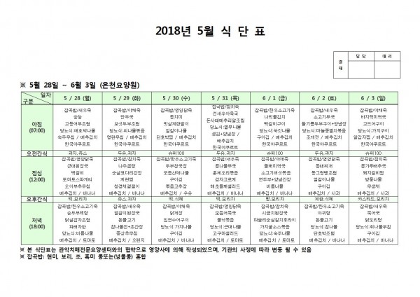 5월 다섯째주 식단표 페이지 정보 작성자 은천노인복지회 작성일18-06-07 10:39 조회207,961회 댓글0건 관련링크 이전글 다음글 목록 답변 본문 5월 다섯쨰주 식단표 이전글 다음글 목록 답변