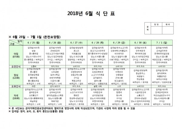 6월 다섯째주 식단표 페이지 정보 작성자 은천노인복지회 작성일18-07-09 16:45 조회212,116회 댓글0건 관련링크 이전글 다음글 목록 답변 본문 6월 다섯째주 식단표 이전글 다음글 목록 답변
