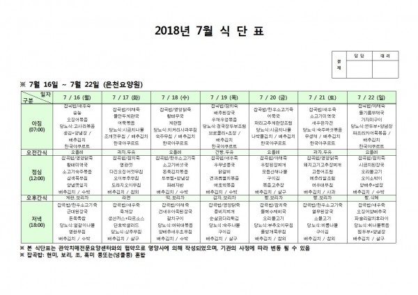 7월 셋째주 식단표 페이지 정보 작성자 은천노인복지회 작성일18-07-23 11:24 조회209,308회 댓글0건 관련링크 이전글 다음글 목록 답변 본문 7월 셋째주 식단표 이전글 다음글 목록 답변