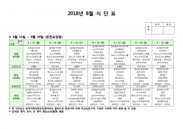 8월 셋째주 식단표 페이지 정보 작성자 은천노인복지회 작성일18-08-27 09:47 조회207,933회 댓글0건 관련링크 이전글 다음글 목록 답변 본문 8월 셋째주 식단표 이전글 다음글 목록 답변