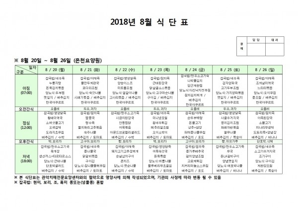 8월 넷째주 식단표 페이지 정보 작성자 은천노인복지회 작성일18-08-27 14:01 조회208,614회 댓글0건 관련링크 이전글 다음글 목록 답변 본문 8월 넷째주 식단표다 이전글 다음글 목록 답변