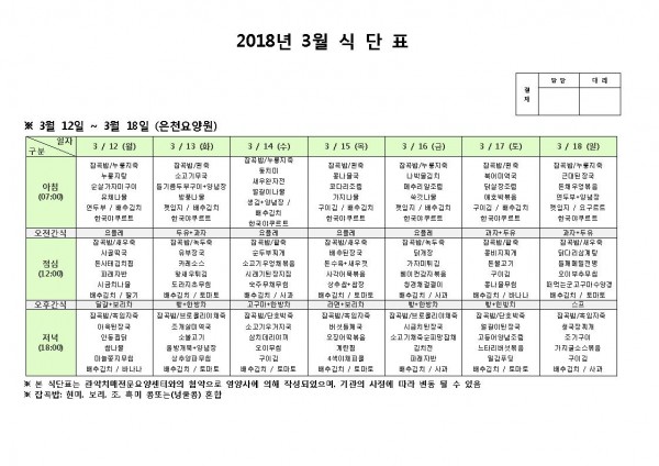 3월 셋째주 식단표 페이지 정보 작성자 은천노인복지회 작성일18-03-12 10:41 조회200,225회 댓글0건 관련링크 이전글 다음글 목록 답변 본문 3월 셋째주 식단표 이전글 다음글 목록 답변