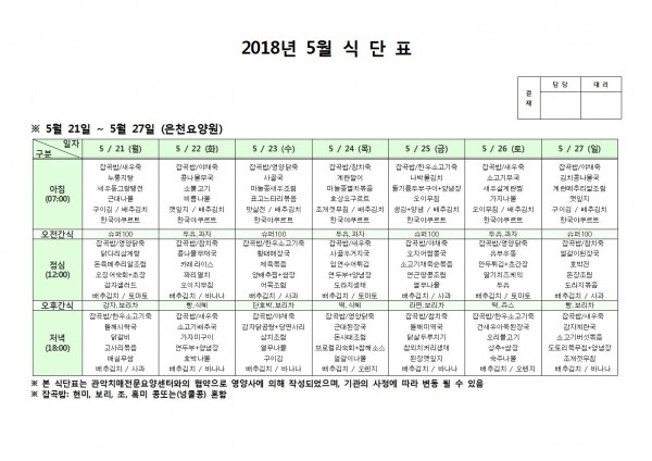 5월 넷째주 식단표 페이지 정보 작성자 은천노인복지회 작성일18-06-07 10:39 조회209,249회 댓글0건 관련링크 이전글 다음글 목록 답변 본문 5월 넷째주 식단표 이전글 다음글 목록 답변