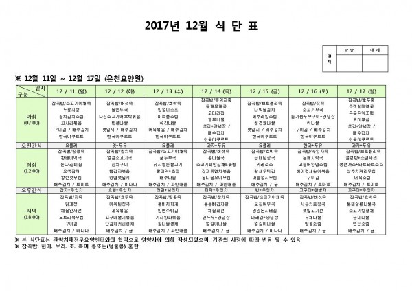 12월 셋째주 식단표 페이지 정보 작성자 은천노인복지회 작성일17-12-11 10:18 조회190,808회 댓글0건 관련링크 이전글 다음글 목록 답변 본문 12월 셋째주 식단표 이전글 다음글 목록 답변