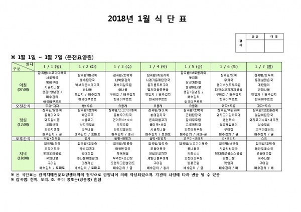 2018 1월 첫째주 식단표 페이지 정보 작성자 은천노인복지회 작성일18-01-03 11:34 조회194,278회 댓글0건 관련링크 이전글 다음글 목록 답변 본문 2018 1월 첫째주 식단표 이전글 다음글 목록 답변