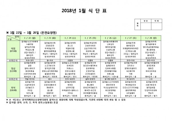 1월 넷째주 식단표 페이지 정보 작성자 은천노인복지회 작성일18-01-24 11:07 조회196,468회 댓글0건 관련링크 이전글 다음글 목록 답변 본문 1월 넷째주 식단표 이전글 다음글 목록 답변