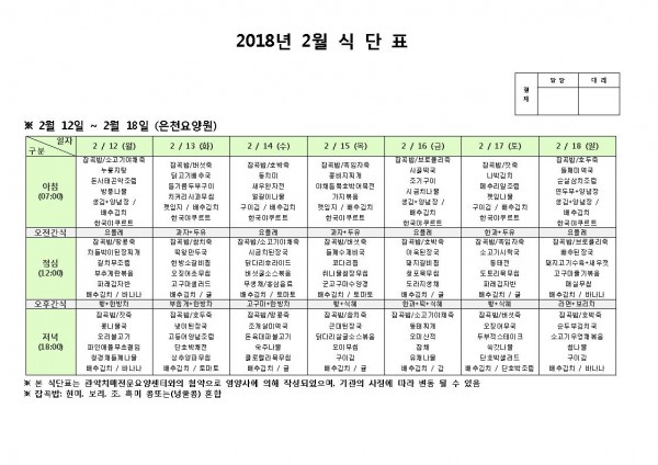 2월 둘째주 식단표 페이지 정보 작성자 은천노인복지회 작성일18-02-12 11:15 조회196,579회 댓글0건 관련링크 이전글 다음글 목록 답변 본문 2월 둘째주 식단표 이전글 다음글 목록 답변