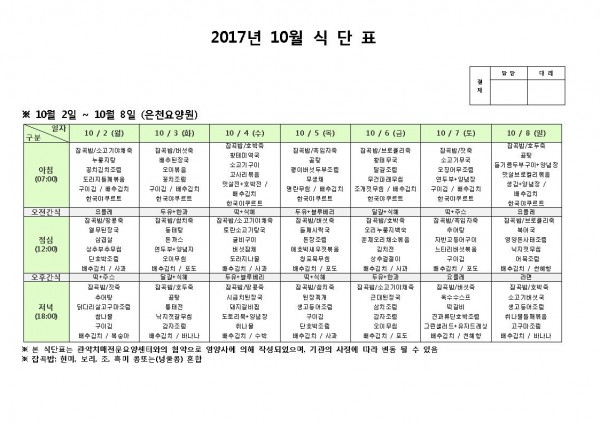 10월 첫째주 식단표 페이지 정보 작성자 은천노인복지회 작성일17-10-11 10:52 조회184,952회 댓글0건 관련링크 이전글 다음글 목록 답변 본문 10월 첫째주 식단표 이전글 다음글 목록 답변