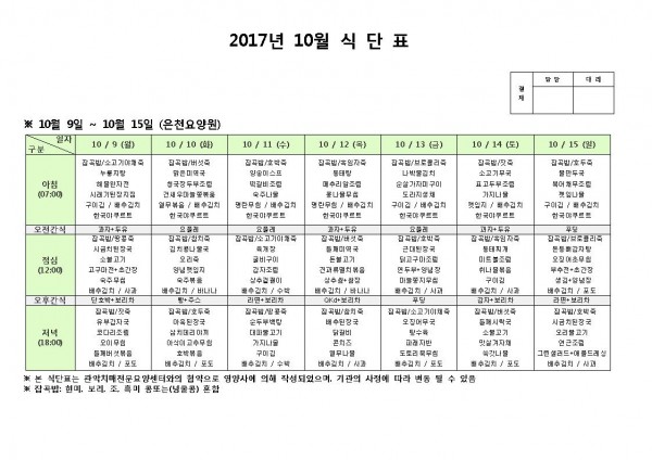 10월 둘째주 식단표 페이지 정보 작성자 은천노인복지회 작성일17-10-17 17:39 조회186,288회 댓글0건 관련링크 이전글 다음글 목록 답변 본문 10월 둘째주 식단표 이전글 다음글 목록 답변