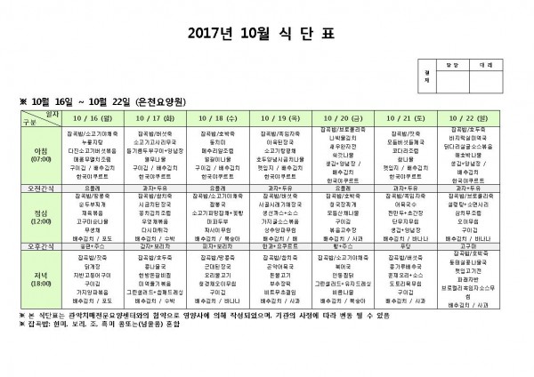 10월 셋째주 식단표 페이지 정보 작성자 은천노인복지회 작성일17-10-17 17:39 조회186,032회 댓글0건 관련링크 이전글 다음글 목록 답변 본문 10월 셋째주 식단표 이전글 다음글 목록 답변
