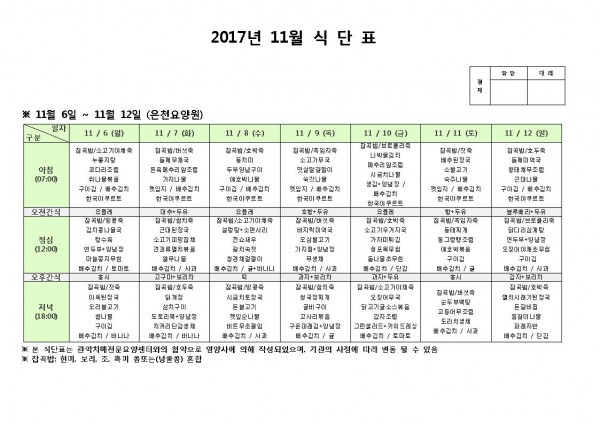 11월 둘째주 식단표 페이지 정보 작성자 은천노인복지회 작성일17-11-09 10:44 조회187,201회 댓글0건 관련링크 이전글 다음글 목록 답변 본문 11월 둘째주 식단표 이전글 다음글 목록 답변