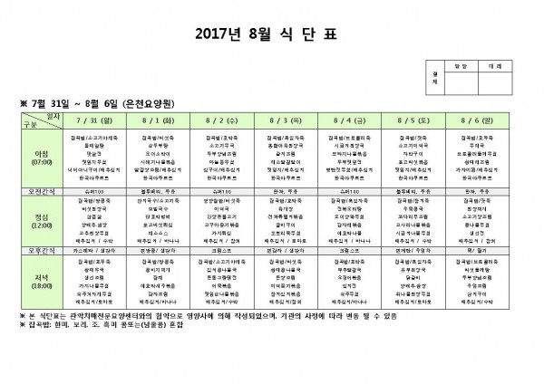 8월 첫째주 식단표 페이지 정보 작성자 은천노인복지회 작성일17-08-01 13:43 조회182,858회 댓글0건 관련링크 이전글 다음글 목록 답변 본문 8월 첫째주 식단표 이전글 다음글 목록 답변