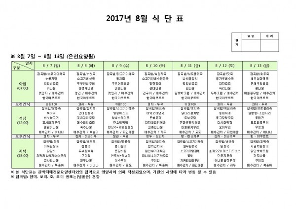 8월 둘째주 식단표 페이지 정보 작성자 은천노인복지회 작성일17-08-07 09:46 조회182,921회 댓글0건 관련링크 이전글 다음글 목록 답변 본문 8월 둘째주 식단표 이전글 다음글 목록 답변
