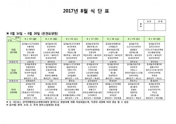 8월 셋째주 식단표 페이지 정보 작성자 은천노인복지회 작성일17-08-14 14:05 조회182,273회 댓글0건 관련링크 이전글 다음글 목록 답변 본문 8월 셋째주 식단표 이전글 다음글 목록 답변