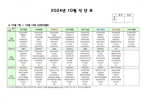 10월 둘째주 식단표 페이지 정보 작성자 은천노인복지회 작성일24-10-04 11:48 조회22,636회 댓글0건 관련링크 이전글 다음글 목록 답변 본문 . 이전글 다음글 목록 답변