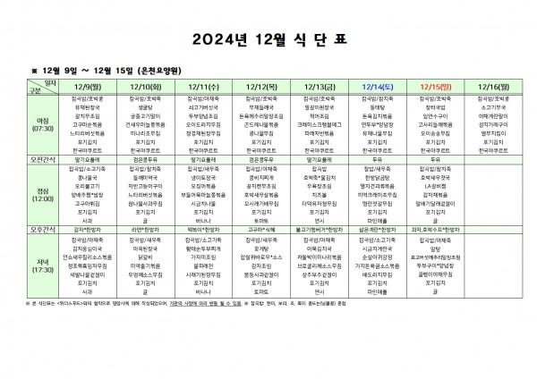 12월 둘째주 식단표 페이지 정보 작성자 은천노인복지회 작성일24-12-06 09:42 조회20,977회 댓글0건 관련링크 이전글 다음글 목록 답변 본문 . 이전글 다음글 목록 답변