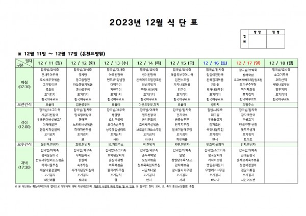 12월 셋째주 식단표 페이지 정보 작성자 은천노인복지회 작성일23-12-08 13:03 조회37,534회 댓글0건 관련링크 이전글 다음글 목록 답변 본문 . 이전글 다음글 목록 답변