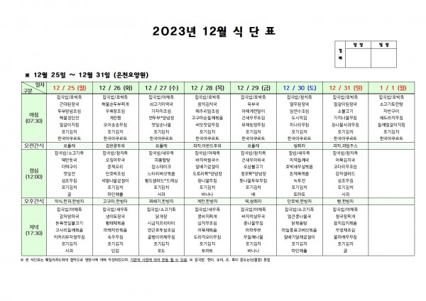 12월 다섯째주 식단표 페이지 정보 작성자 은천노인복지회 작성일23-12-22 15:50 조회35,953회 댓글0건 관련링크 이전글 다음글 목록 답변 본문 . 이전글 다음글 목록 답변