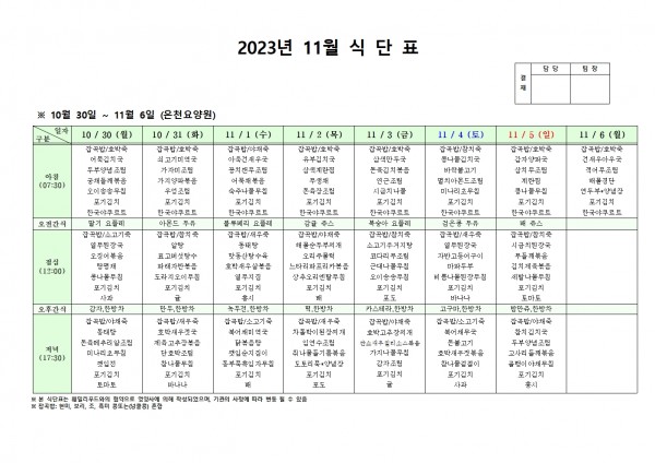 11월 첫째주 식단표 페이지 정보 작성자 은천노인복지회 작성일23-10-26 13:39 조회38,885회 댓글0건 관련링크 이전글 다음글 목록 답변 본문 . 이전글 다음글 목록 답변
