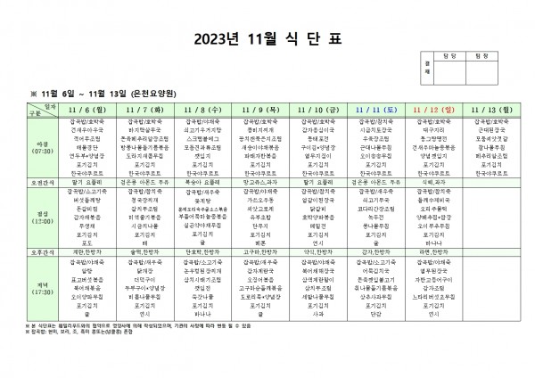 11월 둘째주 식단표 페이지 정보 작성자 은천노인복지회 작성일23-11-02 17:19 조회39,164회 댓글0건 관련링크 이전글 다음글 목록 답변 본문 . 이전글 다음글 목록 답변