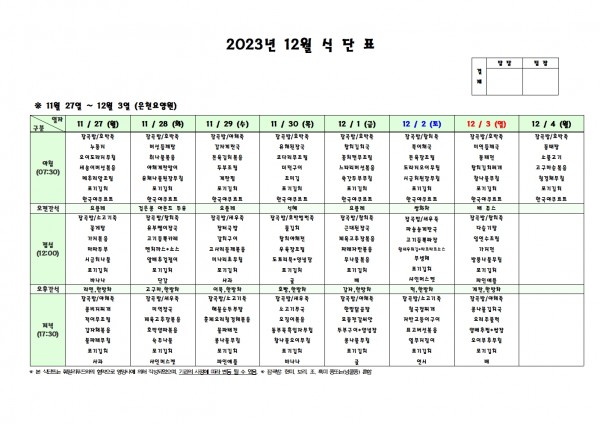 12월 첫째주 식단표 페이지 정보 작성자 은천노인복지회 작성일23-11-24 09:37 조회37,268회 댓글0건 관련링크 이전글 다음글 목록 답변 본문 . 이전글 다음글 목록 답변