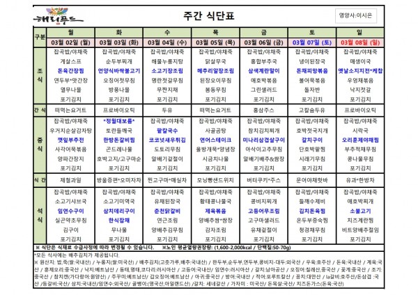 3월 첫째주 식단표 페이지 정보 작성자 은천노인복지회 작성일26-02-27 13:13 조회2,604회 댓글0건 관련링크 이전글 다음글 목록 답변 본문 2월 넷째주 어르신 식단표 안내해 드립니다. 정성과 영양을 담아 준비하겠습니다. 이전글 다음글 목록 답변