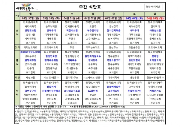 3월 다섯째주 식단표 페이지 정보 작성자 은천노인복지회 작성일26-03-26 17:49 조회586회 댓글0건 관련링크 이전글 다음글 목록 답변 본문 3월 다섯째주 어르신 식단표 안내해 드립니다. 정성과 영양을 담아 준비하겠습니다. 이전글 다음글 목록 답변