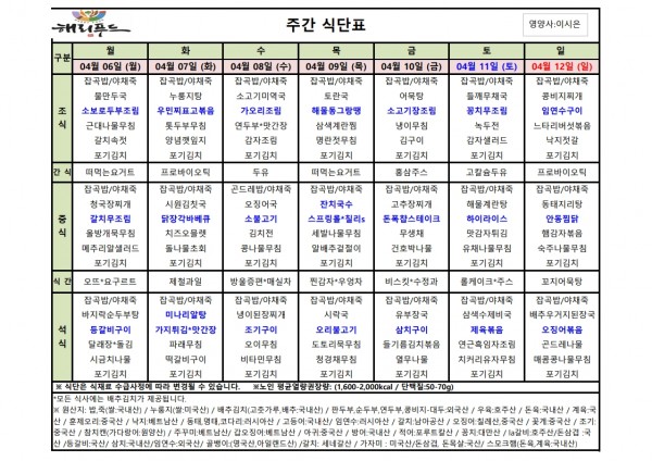 4월 첫째주 식단표 페이지 정보 작성자 은천노인복지회 작성일26-04-03 17:58 조회19회 댓글0건 관련링크 다음글 목록 답변 본문 4월 첫째주 어르신 식단표 안내해 드립니다. 정성과 영양을 담아 준비하겠습니다. 다음글 목록 답변