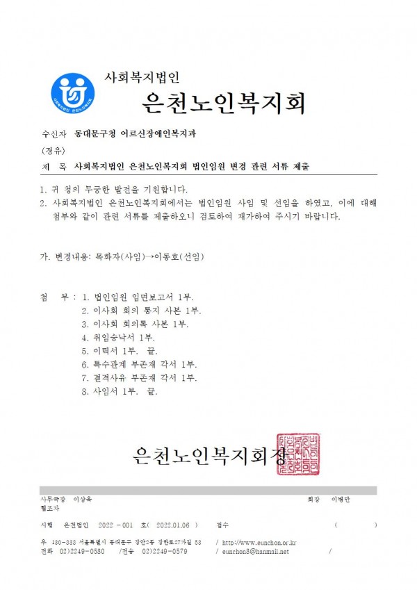 사회복지법인 은천노인복지회 법인 임원 변경 페이지 정보 작성자 은천노인복지회 작성일22-01-06 13:54 조회29,605회 댓글0건 관련링크 목록 본문 사회복지법인 은천노인복지회 법인임원이 아래와 같이 변경되었습니다. 변경내용: 목화자(사임)->이동호(선임) 목록