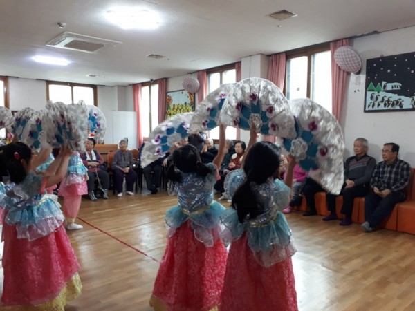 새일문유치원과 연계하여 어르신들에게 아이들의 재롱잔치를 선사하였습니다.