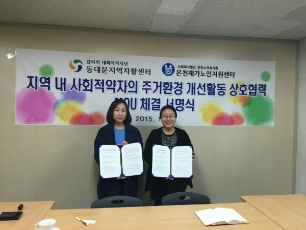 동대문지역자활센터와 협약 페이지 정보 작성자 은천노인복지회 작성일17-01-11 15:47 조회36,476회 댓글0건 관련링크 이전글 다음글 목록 답변 본문 동대문지역 자활센터와 협약을 체결하여어르신들 도배장판 교체에 도움을 주시기로 하였다. 이전글 다음글 목록 답변