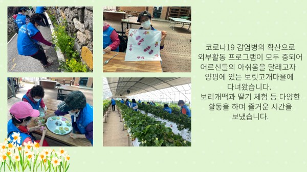 [재가노인지원] 봄 나들이 페이지 정보 작성자 은천노인복지회 작성일22-06-03 17:15 조회18,875회 댓글0건 관련링크 이전글 다음글 목록 답변 본문 재가노인지원센터 어르신들과 양평 보릿고개마을로 나들이를 다녀왔습니다. 이전글 다음글 목록 답변
